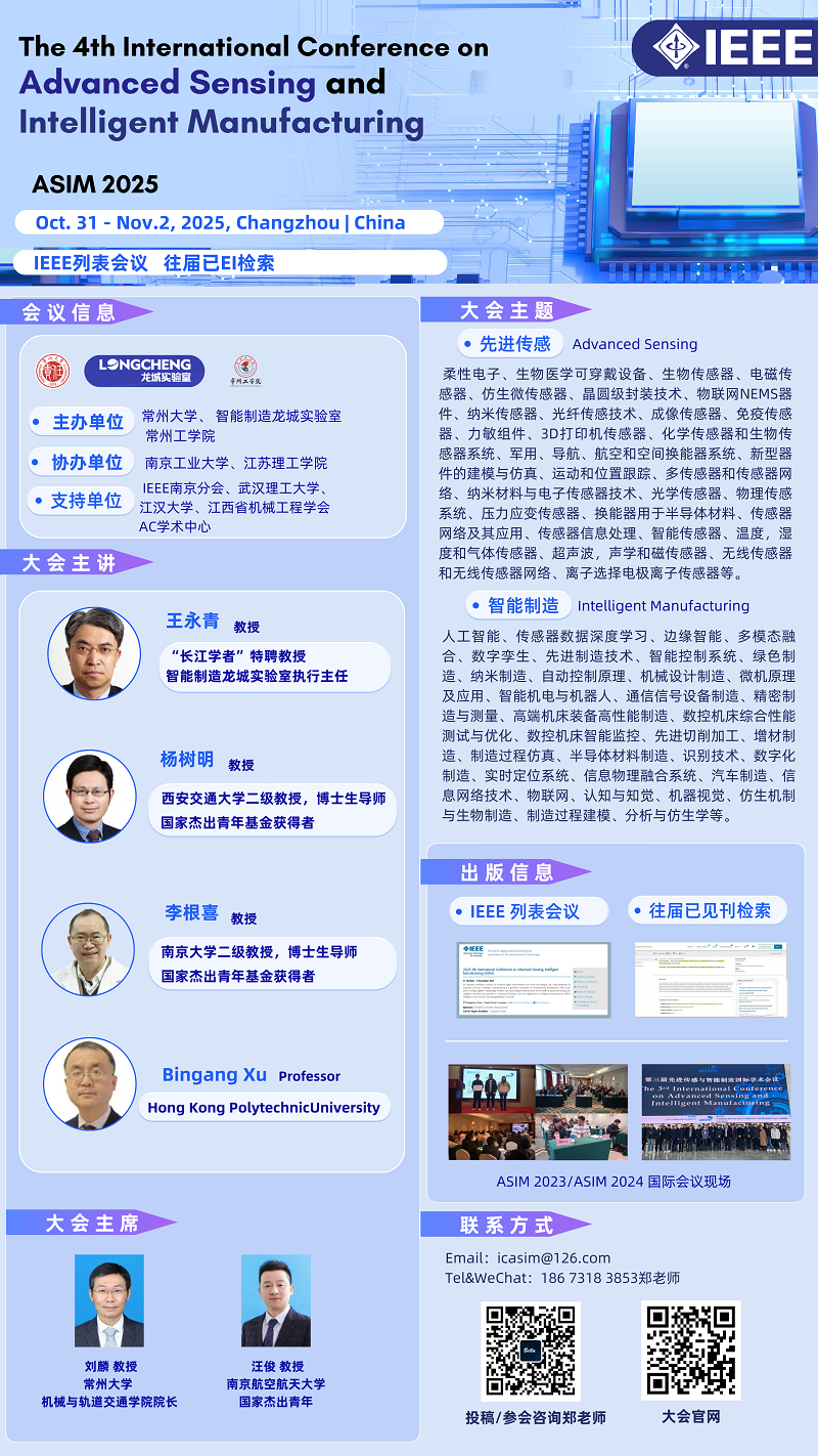 第四届先进传感与智能制造国际学术会议(ASIM 2025)将于2025年10月31日-11月2日在中国常州召开。会议录用的论文将以论文集形式由IEEE出版,收录至IEEE Xplore,并被 EI Compendex 和 Scopus 检索。