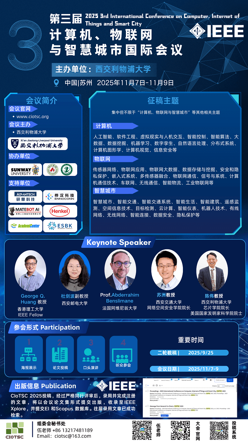 注:2025年第三届计算机、物联网与智慧城市国际学术会议(CIoTSC 2025)委托湖南爱迩思出版有限公司全权负责注册费用收取等财务事宜,并开具正规、有效的税务发票。