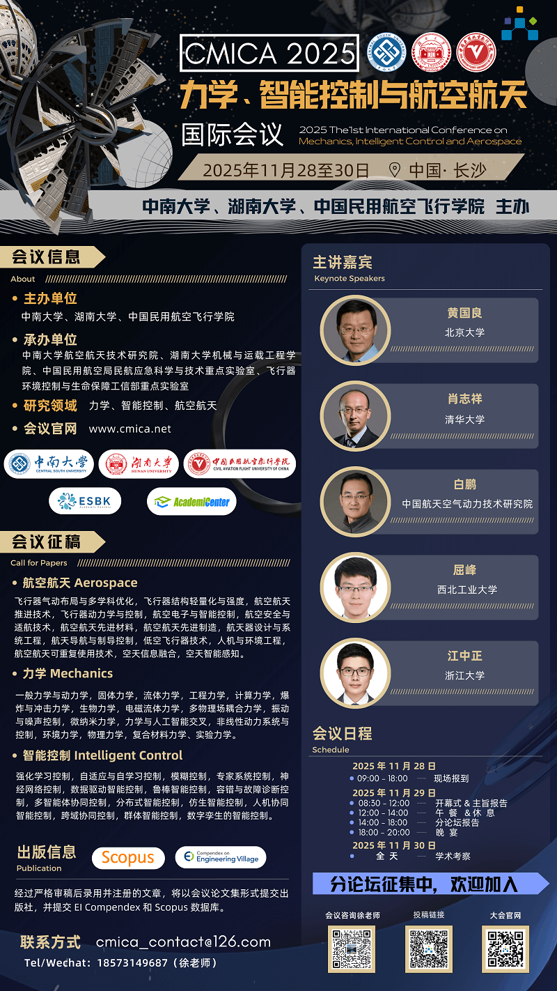 会议聚焦力学、智能控制、航空航天等研究领域,旨在为相关领域的专家学者、科研人员及业界人士搭建一个交流学术成果、探讨前沿问题、促进合作共赢的平台。通过书面报告、口头报告、专题研讨、海报展示等多种形式,分享该领域的最新研究进展、技术创新及应用成果,推动学科交叉融合与行业发展。诚邀各位相关领域同仁踊跃参与,共襄学术盛会。