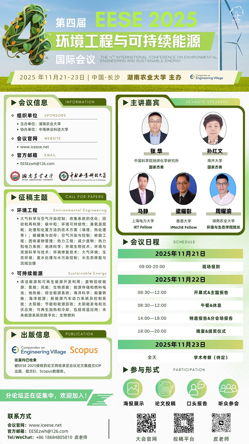 会议全称:2025年环境工程与可持续能源国际会议(The 4rd International Conference on Environmental Engineering and Sustainable Energy)