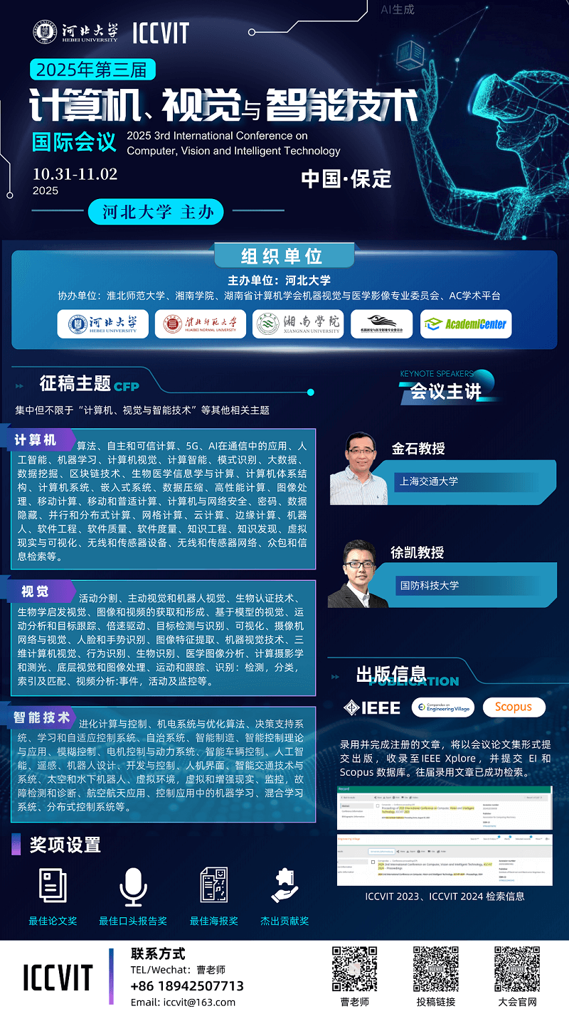 2025年第三届计算机、视觉与智能技术国际会议(ICCVIT 2025)将于2025年10月31日-11月2日在中国保定召开。ICCVIT 2025已成功列入IEEE列表会议,由IEEE北京分会提供技术支持。会议聚焦计算机、视觉和智能技术,旨在为专家、学者和研究人员提供一个国际平台,分享研究成果,讨论问题和挑战,探索前沿技术。诚邀高校、科研院所、企业等有关方面的专家学者参加会议。